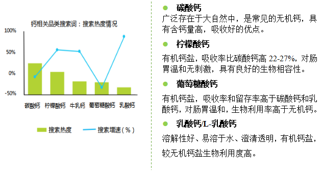 在钙和氨糖的协同搭配增效组合中,更多类型的钙得到消费者的关注,柠檬酸钙、乳酸钙均有超50%的搜索增速,“碳酸钙”、“柠檬酸钙”等钙盐的关键词增势向好。