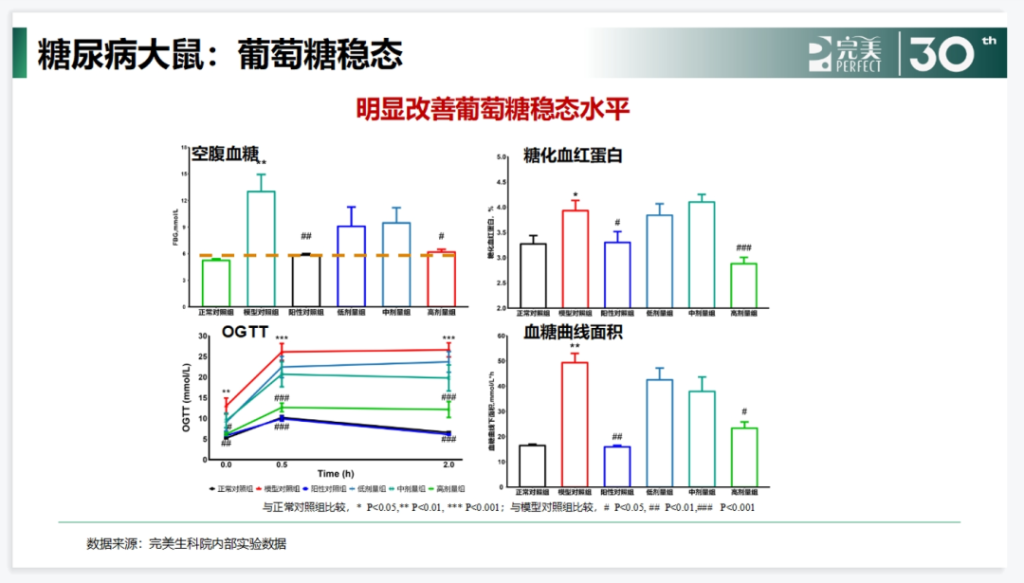 经过大鼠实验探究,桑叶提取物和沙棘蛋白肽配伍,具有较好的协同增效作用,葡萄糖下降率相比单独使用沙棘蛋白肽显著提高,且可以降低大鼠体重增量27.45%,明显改善肥胖大鼠的餐后血糖水平。针对糖尿病大鼠,可以明显改善糖尿病大鼠的葡萄糖稳态水平,可以抑制α-葡萄糖苷酶的活性,减少葡萄糖的生成;但不影响正常大鼠的空腹血糖。